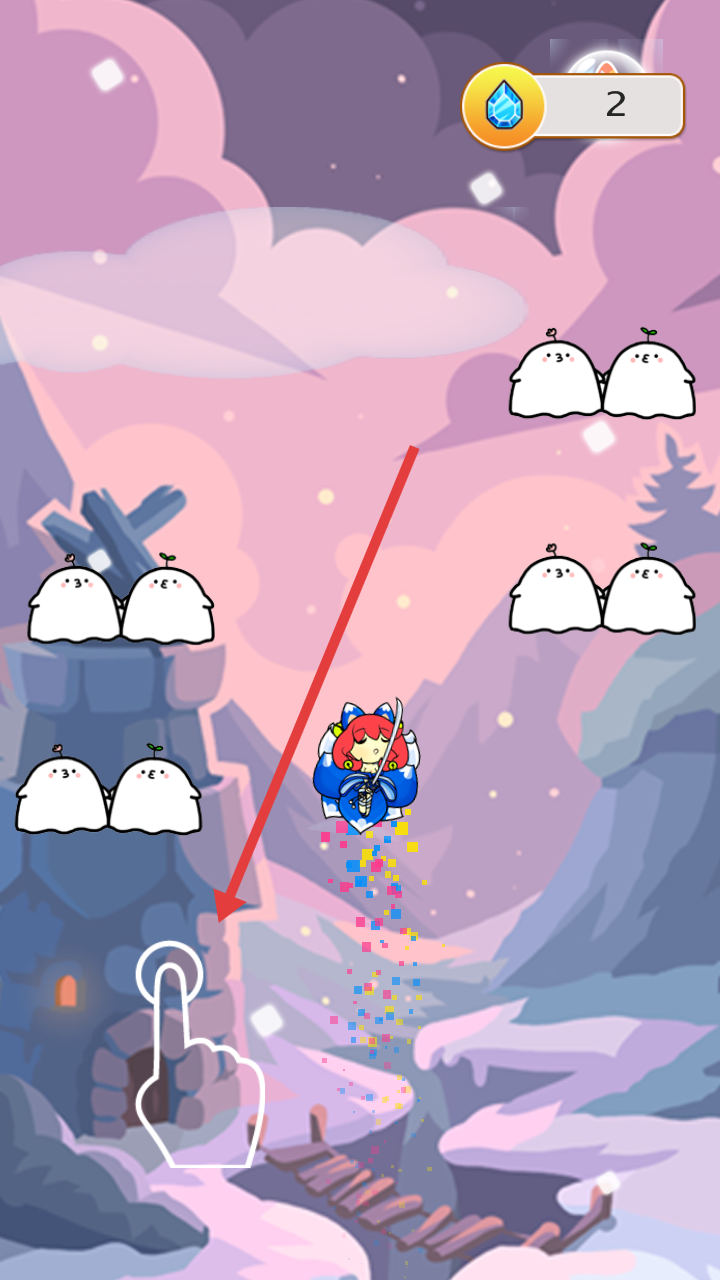 2、在关卡中,长按屏幕蓄力,瞄准白色团子敌人发射角色,利用弹射机制清理敌人,注意避开尖刺,收集蓝色水晶。