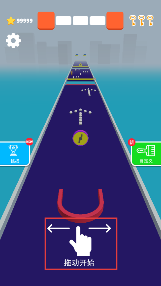 1、按住屏幕并左右滑动控制红色磁石,吸附路上白色小球,注意避开障碍,收集钥匙,向终点推进。