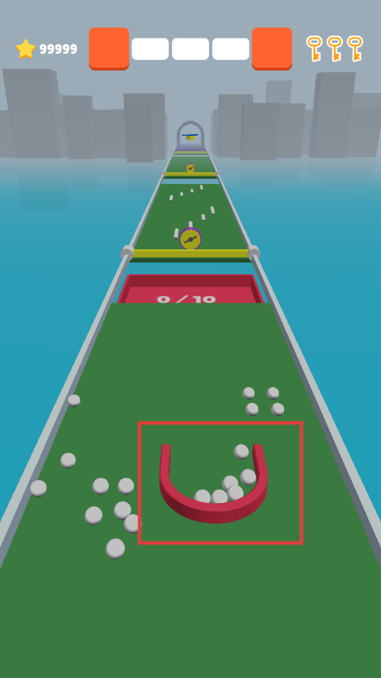 2、跑酷中,让磁石经过红框区域,吸附更多小球,利用场景加速或改变路线,高效的进行收集。