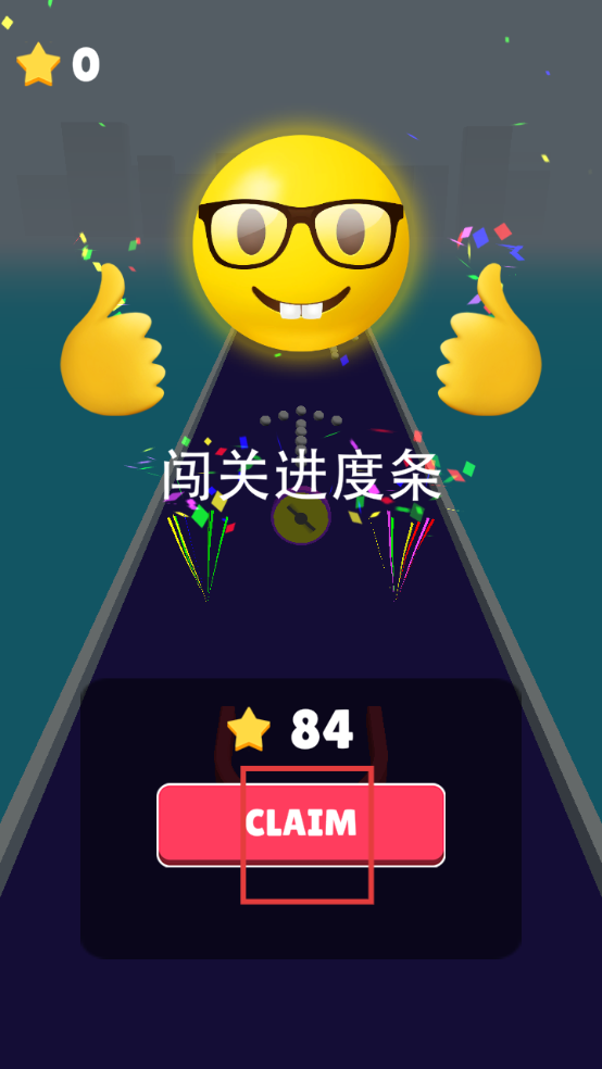 3、闯关成功,出现进度条与奖励,点击CLAIM按钮领取84星星,继续下一关,挑战更高难度与收集目标。