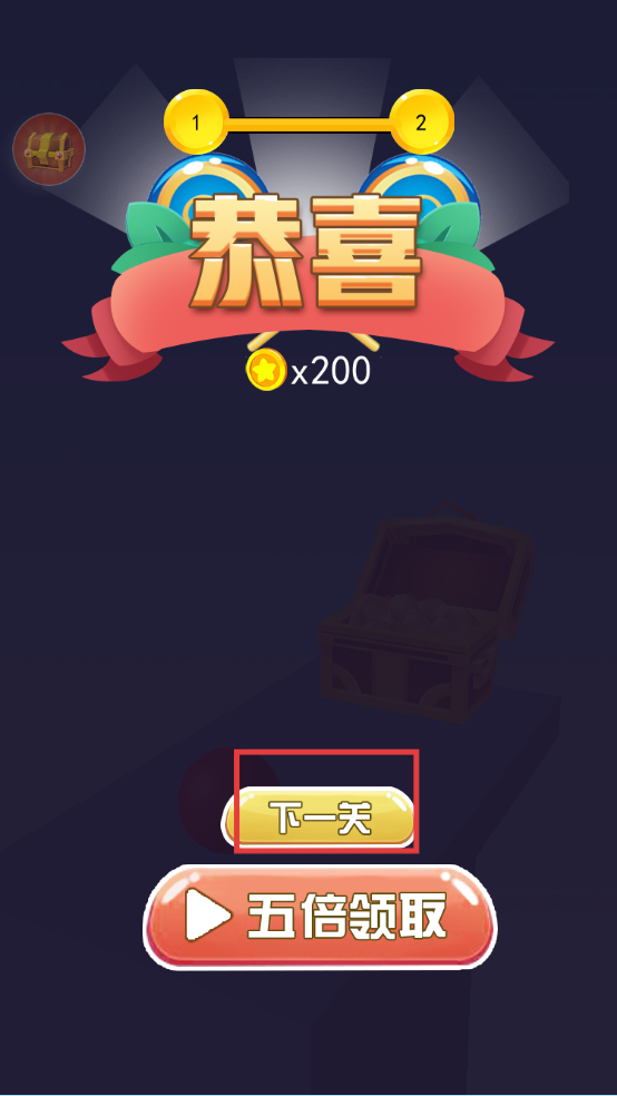 3、成功通关后,界面显示获得200金币奖励,点击“下一关”按钮,继续挑战更难关卡,积累金币解锁道具。