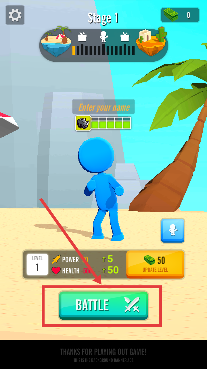 1、点击BATTLE按钮,进入Stage1,操控蓝色火柴人,开启沙滩战斗冒险。