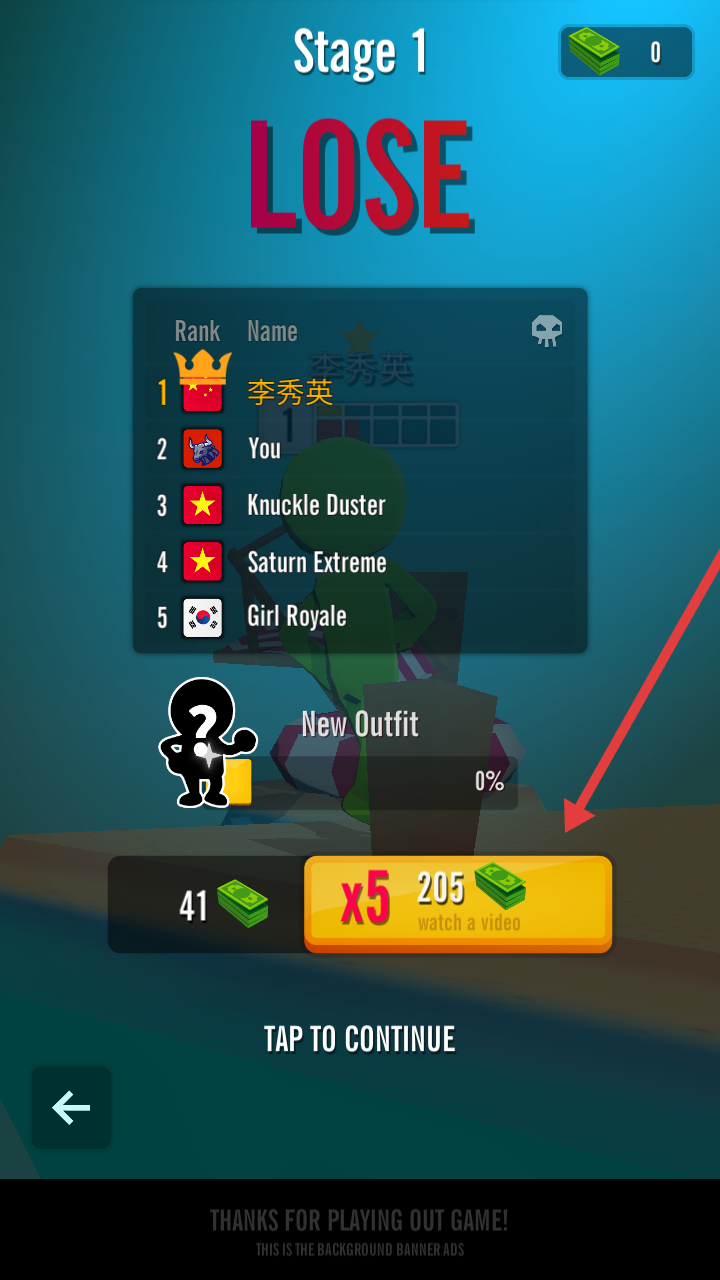 3、若LOSE,可点黄色按钮看广告获奖励,或TAPTOCONTINUE回主界面,强化属性后重挑战。
