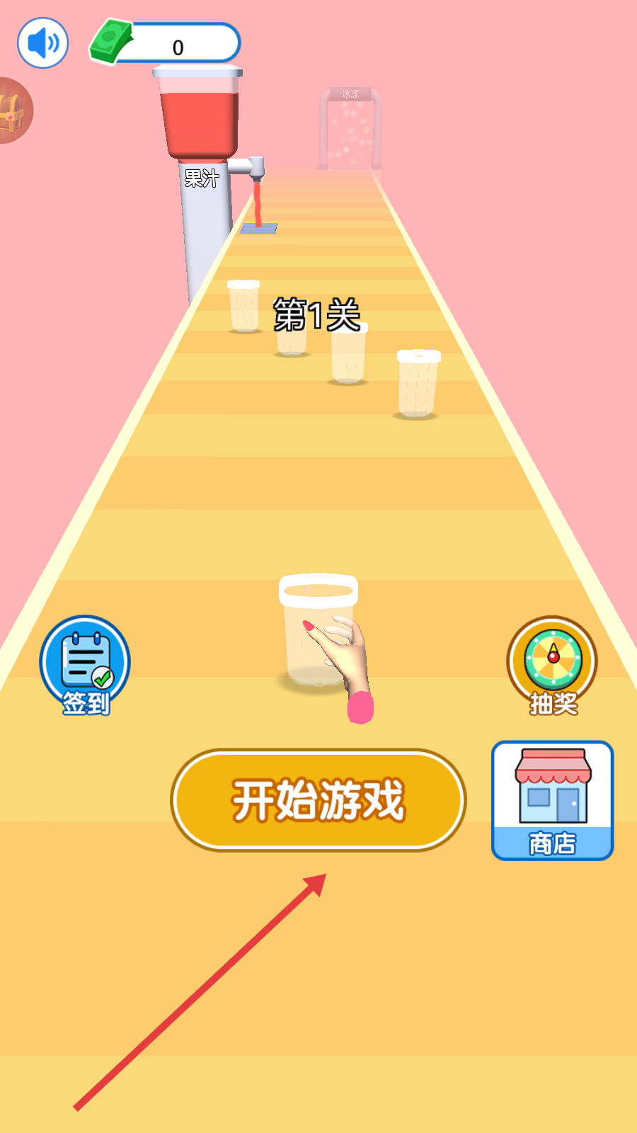 1、点击开始游戏,进入果汁闯关第1关,操控手移动杯子,准备接取果汁。