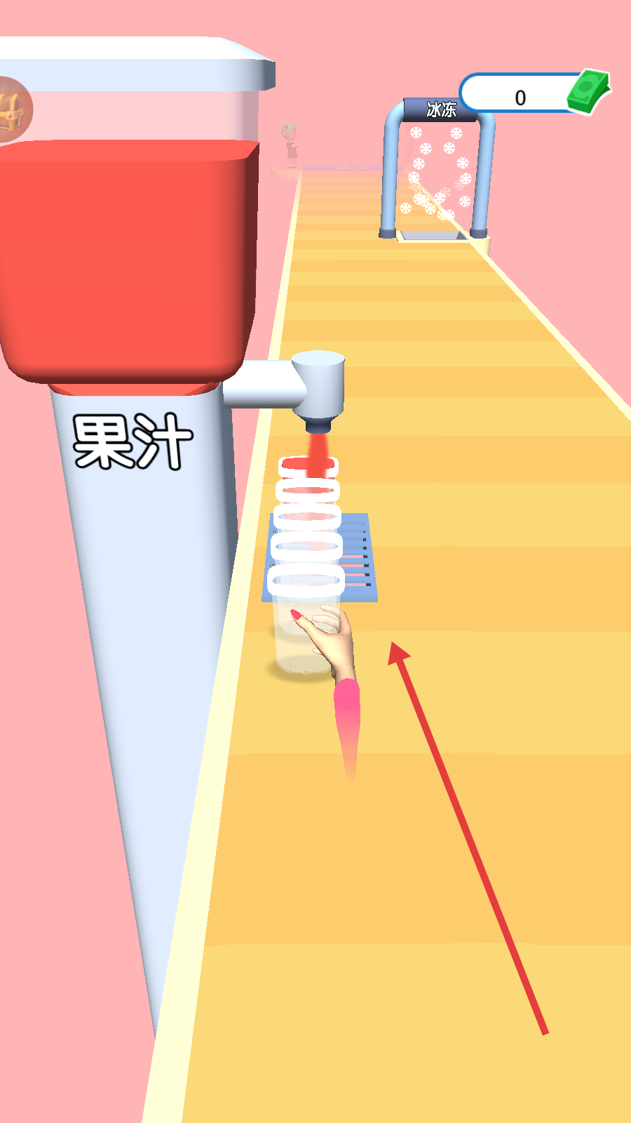 2、拖动杯子到果汁机下接满红色果汁,再移向冰冻区域,让果汁降温,顺利通过路径障碍。
