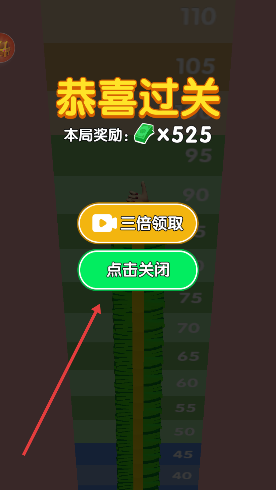 3、通关后,点击点击关闭弹窗,领取525金币奖励,可选择看广告三倍领取,继续挑战下一关。
