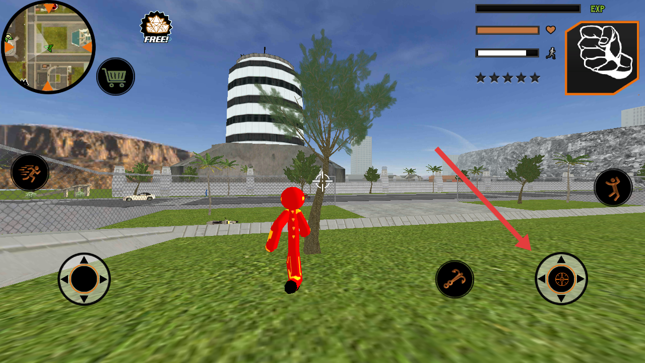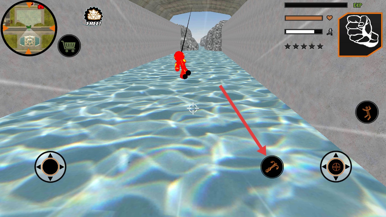 2、在河道场景,点击钩锁按钮,瞄准对岸发射钩锁,借力跨越河道,遇敌人时,用拳头或枪械攻击,探索地图。