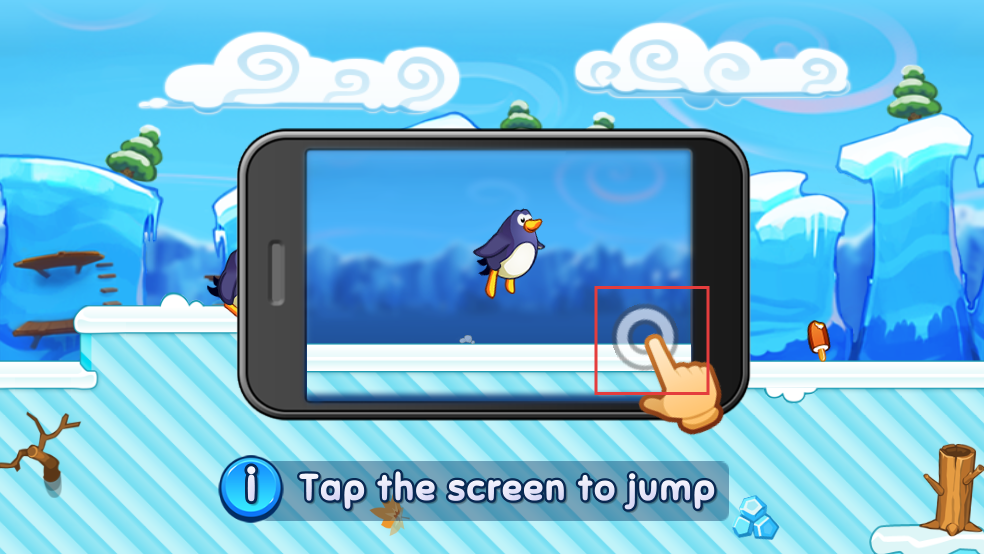 1、进入游戏,根据提示点击屏幕,操控企鹅跳跃,跨越地形障碍,开始在冰雪场景冒险。