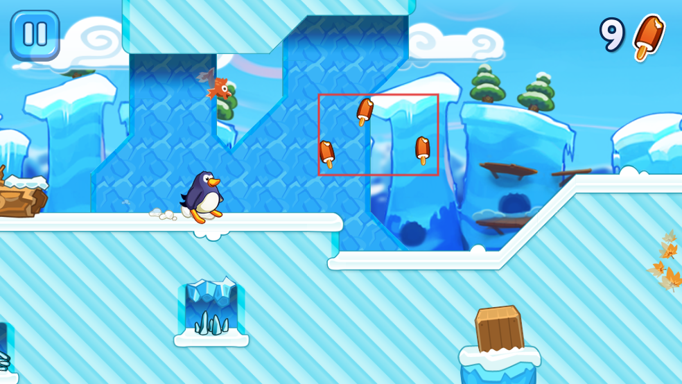 2、前行中留意空中的冰棍道具,规划跳跃时机,通过点击让企鹅精准获取,积累收集数量,同时避开危险地形。