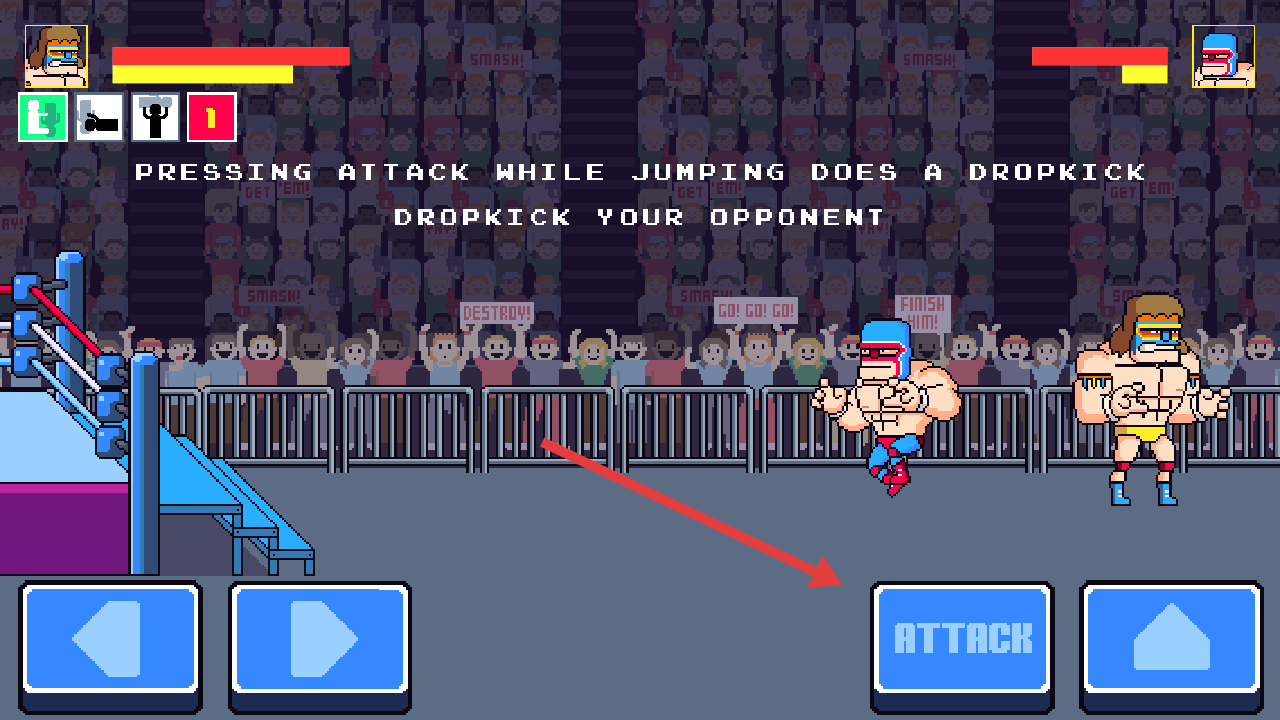 1、在RowdyCityWrestling标题页,点击TAPTOPLAY进入像素摔跤对战,选角色开局。