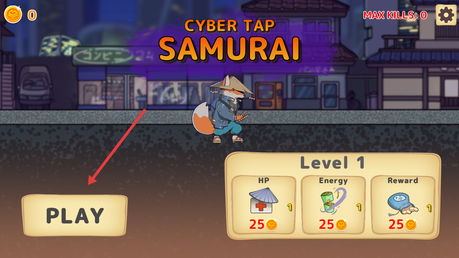 1、在CyberTapSamurai主界面,点击PLAY进入Level1,可花费金币提升HP、Energy、Reward属性。