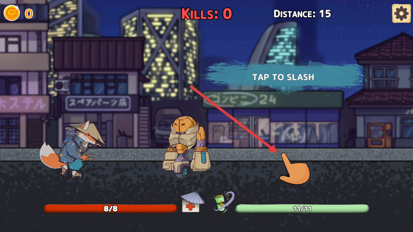 2、进入战斗,操控狐狸武士,看到TAPTOSLASH提示时,点击屏幕触发斩击,消灭橙色机器人敌人。