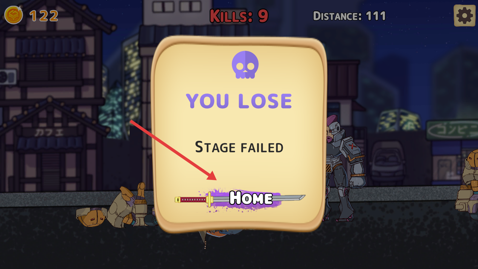 3、若失败,点击HOME返回主界面,用金币升级HP、Energy、Reward属性,强化后重新挑战,争取更远Distance。