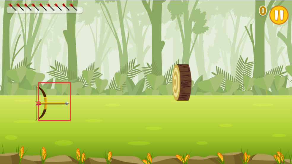 1、进入游戏场景,瞄准红框内的弓箭,长按屏幕蓄力,调整角度,让箭射向远处的靶心。