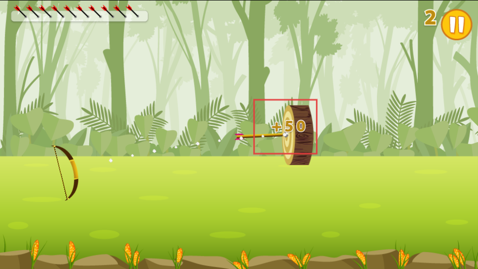 2、射箭时,关注红框内靶心,箭射出后若命中,会显示+50得分,根据箭的轨迹微调蓄力时长和角度。