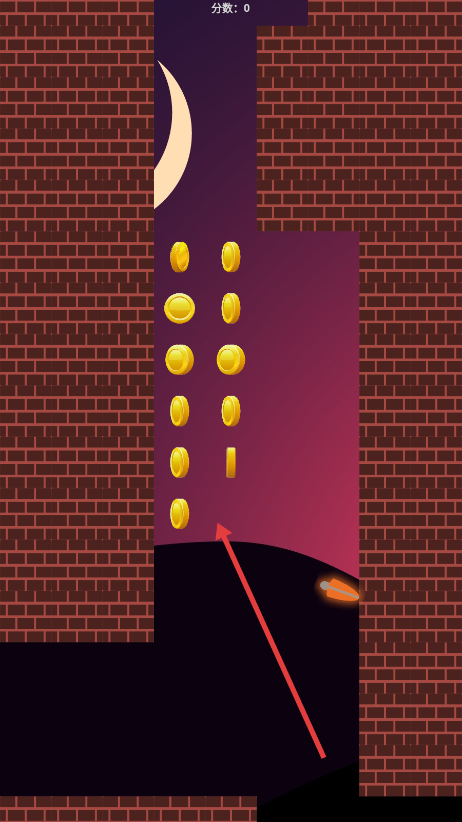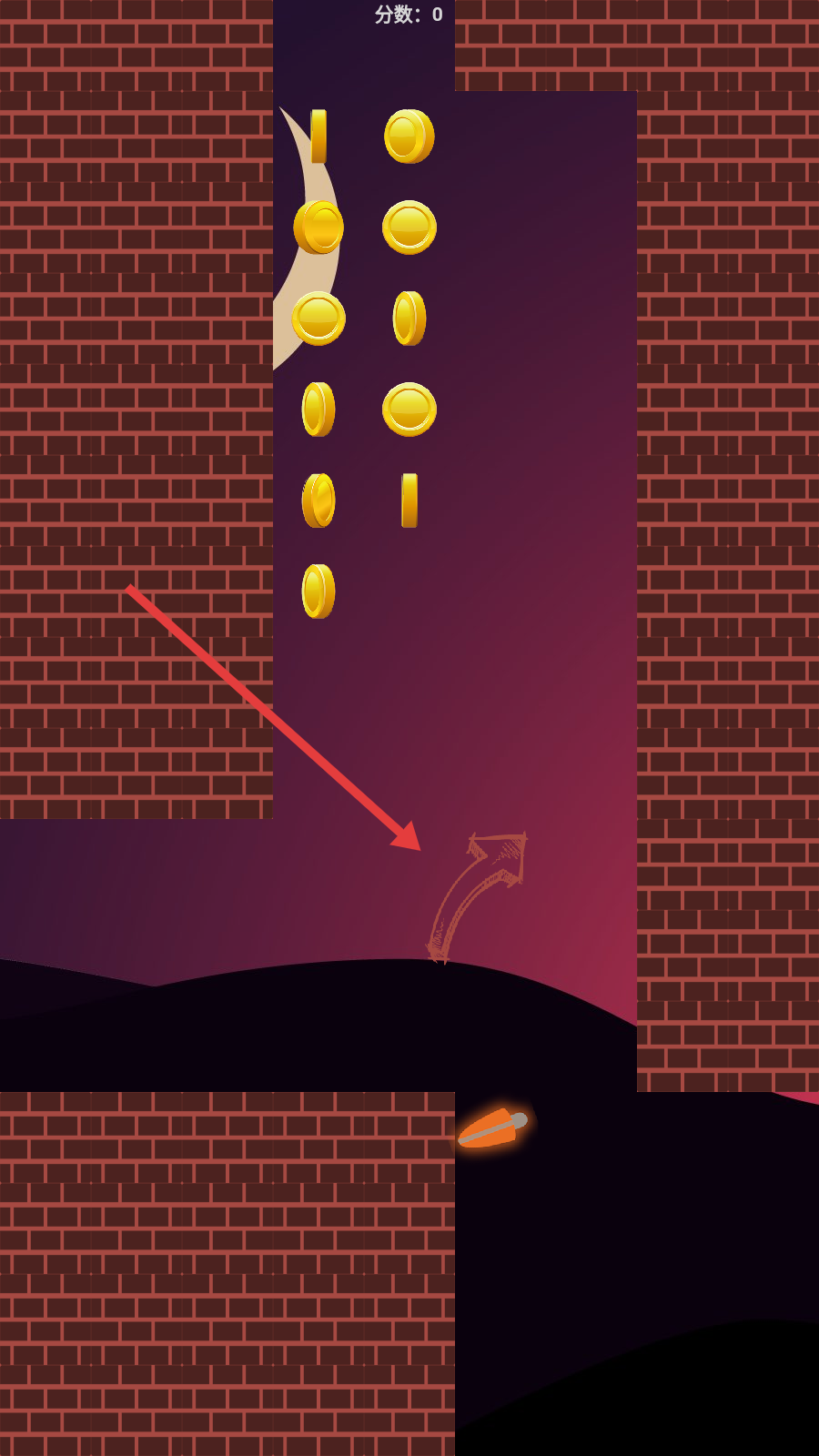 2、弹起时,瞄准金币轨迹,调整弹射角度,收集金币,避开墙壁,连续跳跃积累分数。