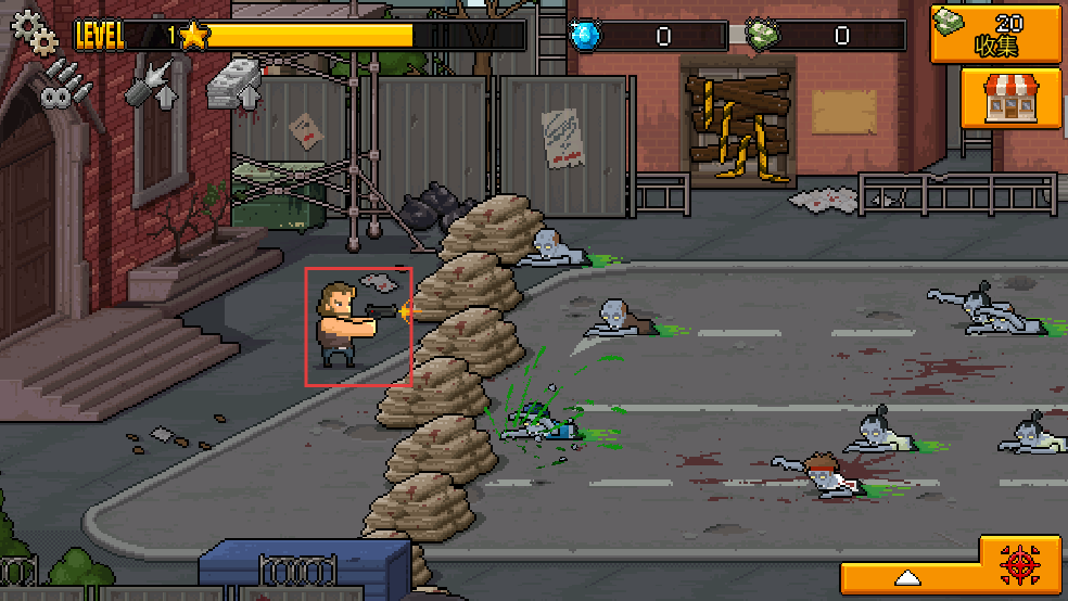1、操控角色利用掩体沙袋堆,瞄准僵尸射击,优先清理近处敌人,保持移动躲避攻击。