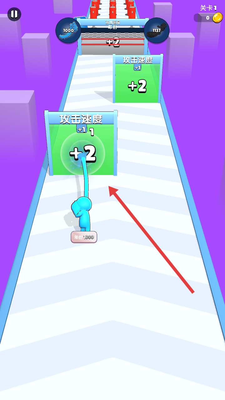1、点击开始,操控蓝色角色沿跑道前进,优先选择攻击速度增益门,提升战斗属性。