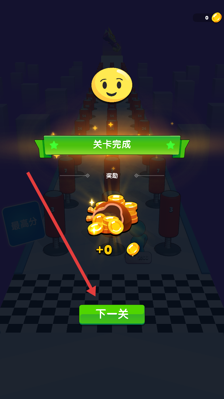 3、关卡完成后,点击下一关,继续挑战更高难度跑道,积累金币,解锁更多增益道具。