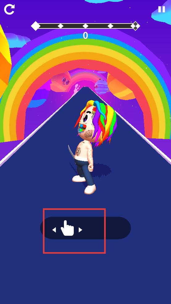 1、进入作品后,点击底部箭头按钮,操控角色在彩虹道路前行,注意跟随节奏,准备应对前方障碍。