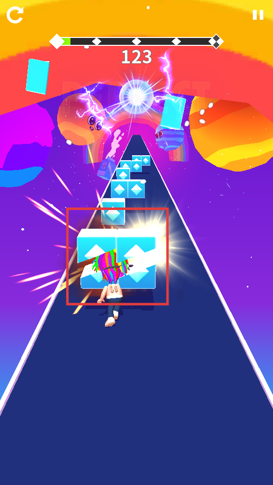 2、遇到蓝色方块障碍,依据节奏及时左右移动角色,精准的切割方块,持续推进,获取分数。
