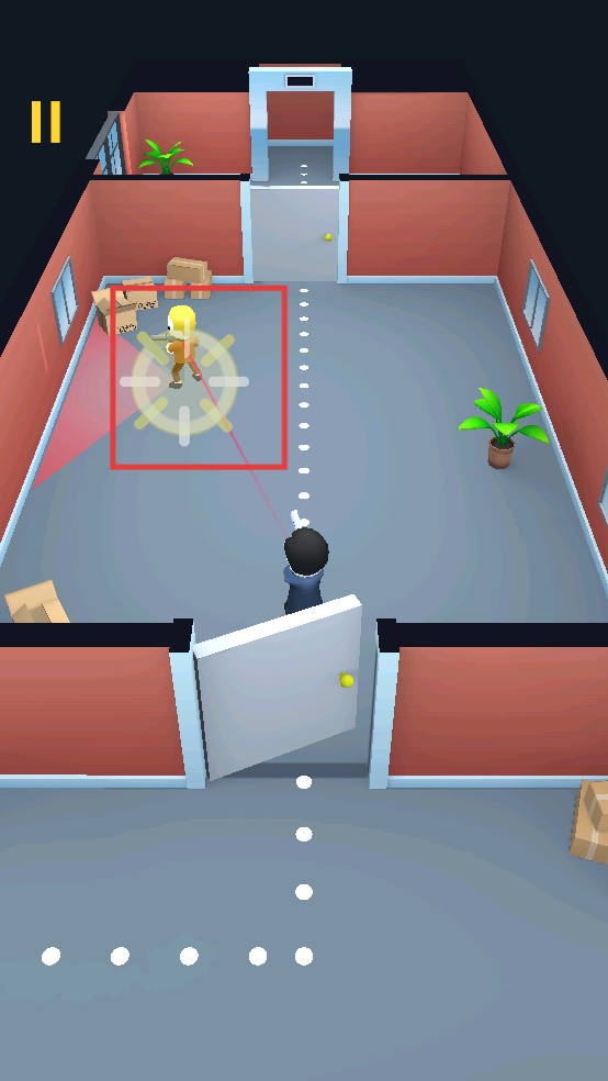 2、进入房间后,瞄准红框内的黄色敌人,利用枪械射击,借助门等掩体规避攻击,逐步推进消灭目标。