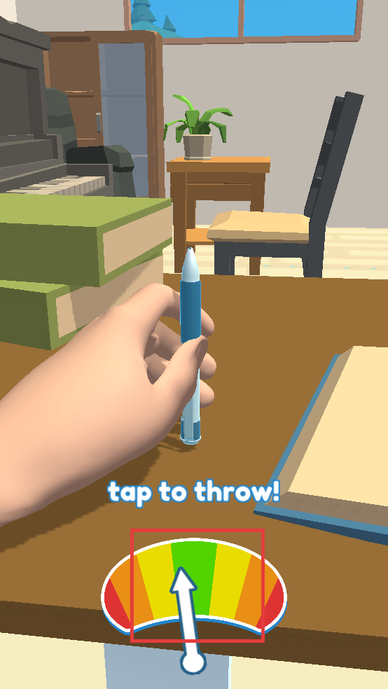 1、室内场景里,紧盯下方力度条,待指针落至绿色最优区时点击屏幕,将蓝色笔奋力的投掷出去。