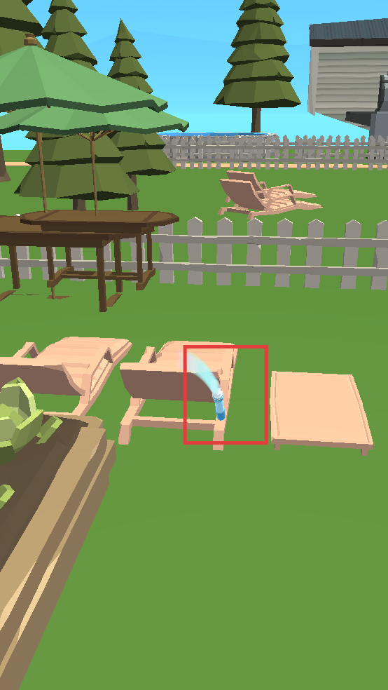 2、笔弹出后进入室外,利用躺椅、桌椅等家具的弹射效果,调整笔的飞行轨迹,让其在场景中不断弹跳。