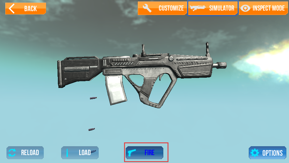 2、在模拟界面中点击底部红框内的“FIRE”按钮,触发射击动作,观察子弹发射轨迹、弹壳弹出效果。
