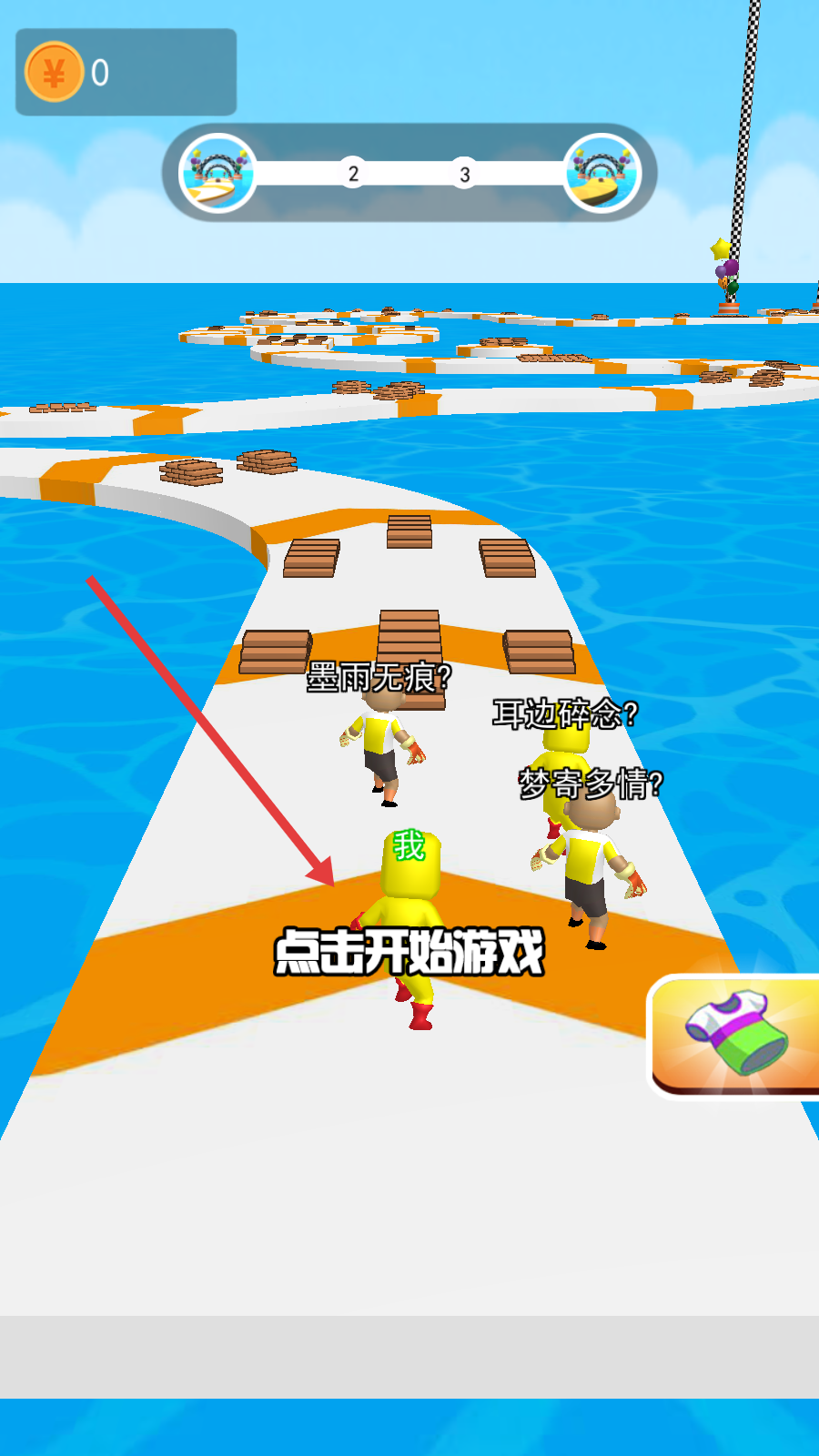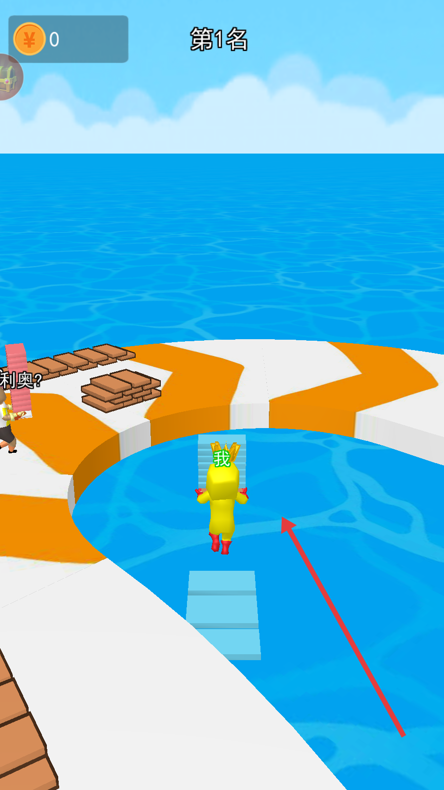 1、点击开始游戏,操控黄色角色在水上跑道前进,避开落水,超越其他玩家。