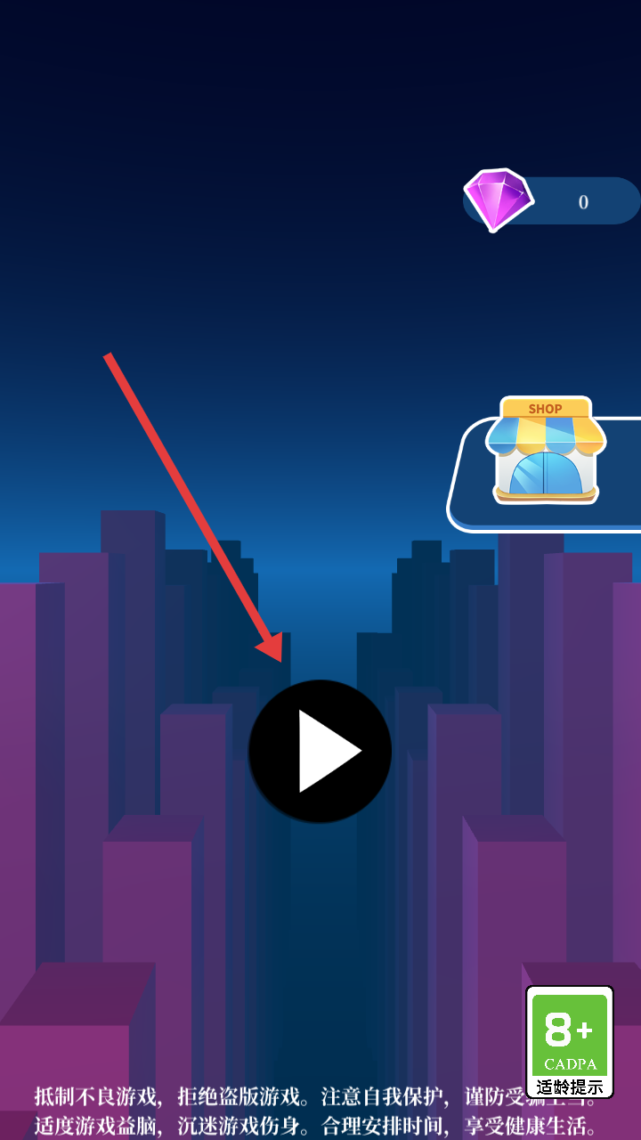 1、点击主界面黑色播放按钮,进入关卡1,操控绿色球体向上移动,撞击带有向上箭头的方块。