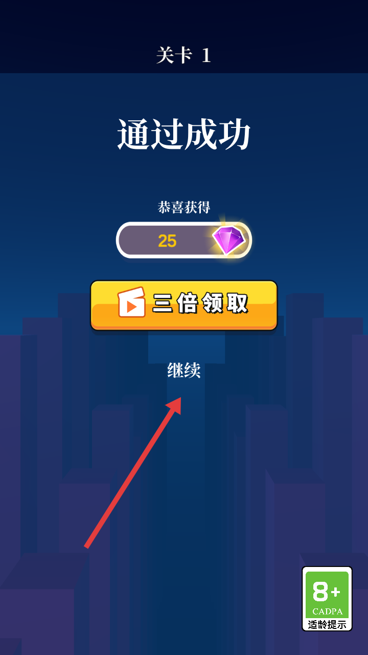 3、成功通关后,可选择看广告三倍领取钻石,或点击继续进入下一关,积累钻石解锁更多内容。