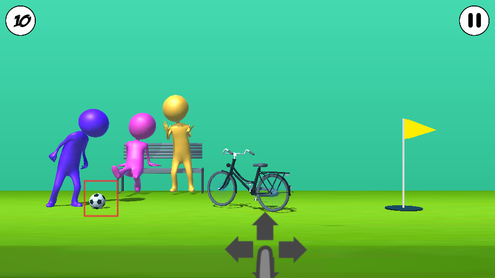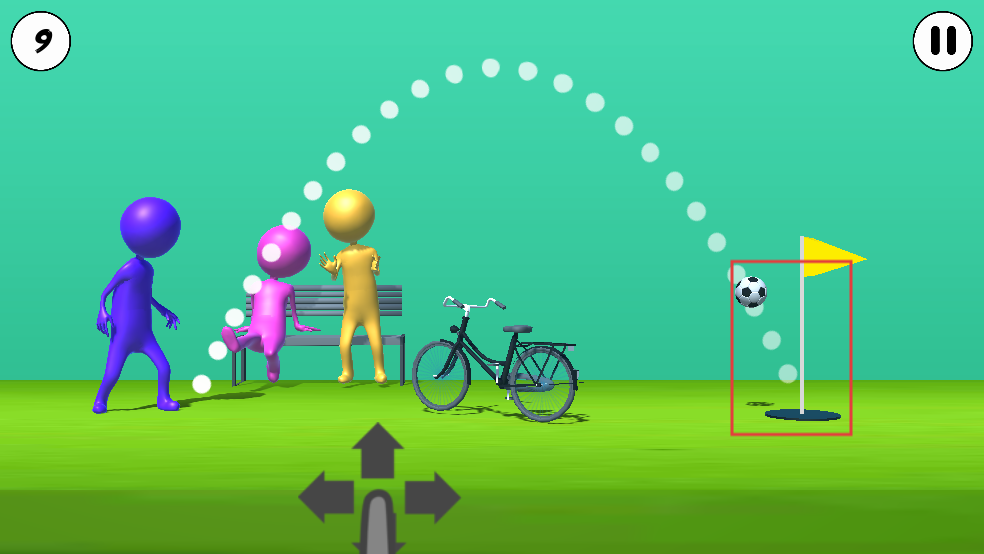 2、调整方向键,让足球沿虚线轨迹飞行,瞄准红框内旗杆区域,精准将球踢至目标范围,达成关卡目标。