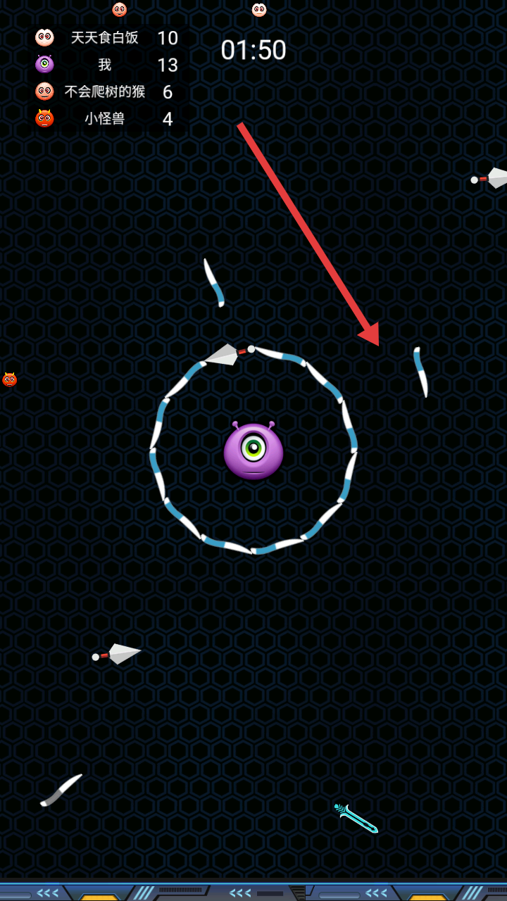 2、利用旋转武器防御并反击,躲避敌方攻击,优先消灭弱小对手,积累击杀数提升排名。