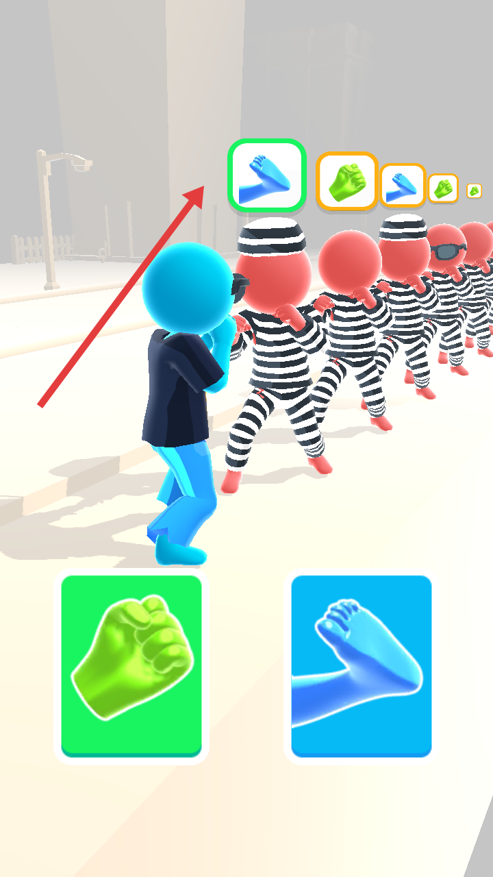 1、点击PLAY按钮,操控蓝色小人在街道场景前进,遭遇红衣囚犯敌人,准备战斗。