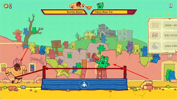 1、摔跤对战时,看准时机释放野牛,借助弹射力飞出场外,开始飞行挑战。