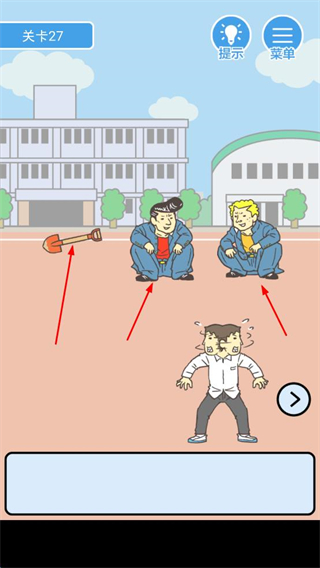 1、挑战游戏关卡,观察场景铁锹与蹲坐人物,点击道具或互动,制造干扰,帮角色躲避,完成翘课。