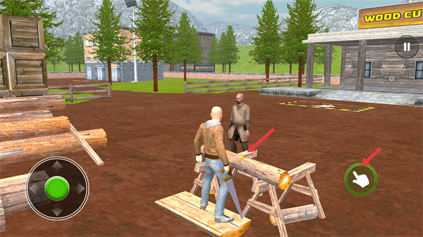 4、界面中角色在木材架旁,点击右侧交互按钮可触发【锯木】操作,完成木材加工任务。