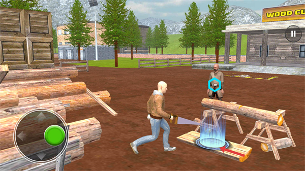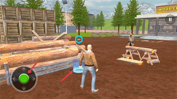 2、界面呈现木材场地场景,左侧有移动操控按钮,操控角色靠近【蓝色】交互区域。