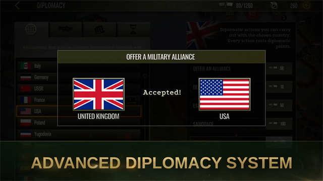 战略与战术2是一款超硬核的二战沙盒手游,把背景定在硝烟弥漫的欧洲大战场,选好阵营去重温那些史诗级的战役,靠脑子去改写历史并让自家地盘冲向巅峰,指挥大炮步兵甚至是海空军去各处领土横扫,跨越亚洲和欧洲的广阔版图去到处征战,在不断变幻的局势里带队走向辉煌。