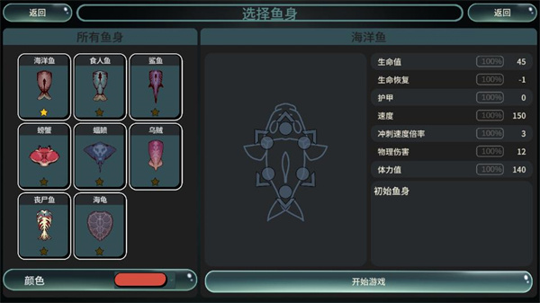 1、进入主页后,可点击喜欢的鱼身并观察所具备的不同属性;
