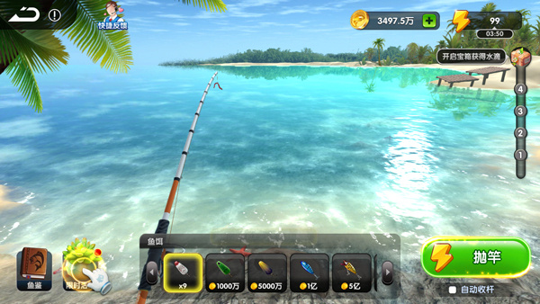 3、还可在岸边享受钓鱼的玩法模式,并根据手指提示进行操作;