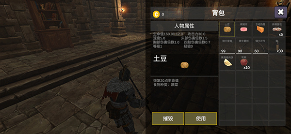 1、进入游戏后,可观察背包所拥有的东西并不断收集增加;