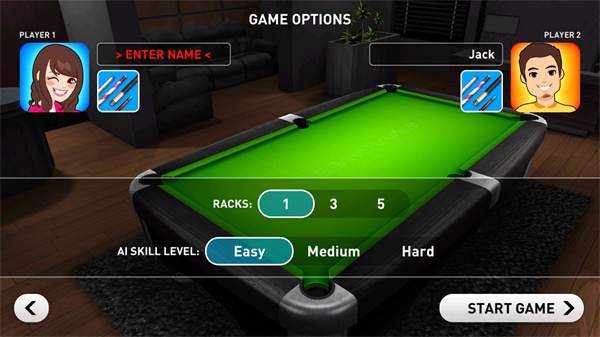 4、最后设定比赛局数与电脑的难易程度,点击开始游戏即可尽情享受台球乐趣。