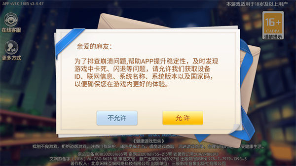 1、首次打开游戏请点击允许按钮,授权系统获取设备信息以确保运行稳定;