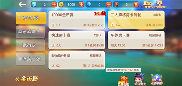 4、您还可以切换至比赛场模式,通过消耗房卡或观看视频来报名参加各类赛事。