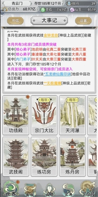 2、在宗门建设界面合理分配各项资源,通过武技阁与练功房等建筑提升整体战力;