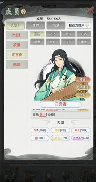 3、进入成员列表详细查看弟子们的天赋属性,为不同潜力的弟子安排专属养成路线;