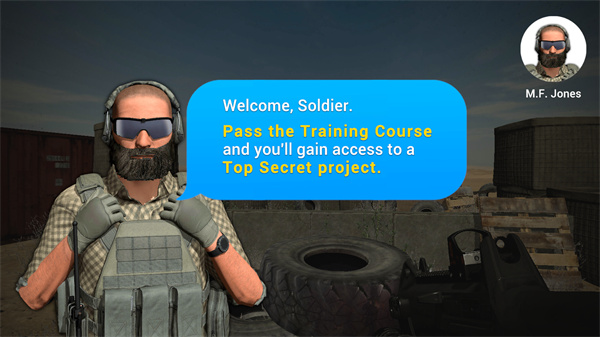 2、进入关卡后与教官对话并接受训练任务,通过完成初级训练课程来解锁后续的秘密项目内容;