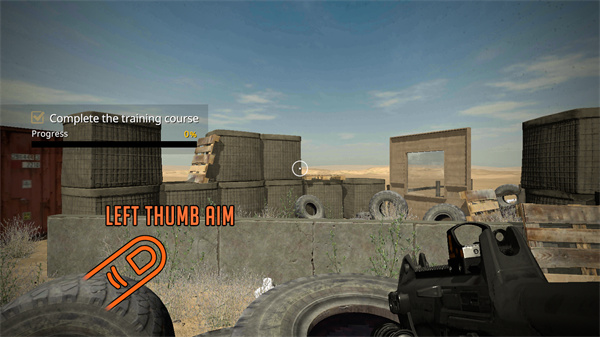 4、在训练场中滑动左侧屏幕来控制准星瞄准目标,配合右侧操作完成射击并达成百分之百的任务进度。